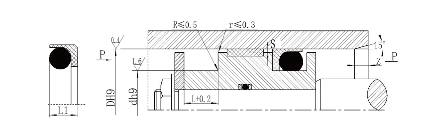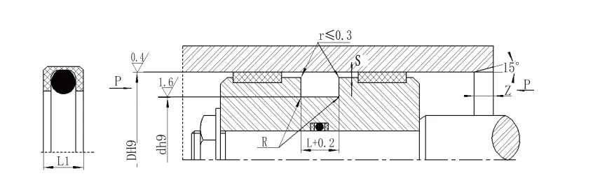 | Диапазон диафрагмы D H9 | Диаметр канавки D H9 | Ширина канавки Л+0.2 | Высота печать L1 | Круглые углы Rмаксимум | Радиальный клиренс смаксимум | Чат Z.мин | Диаметр провода уплотнительного кольца дюймовыйO | |