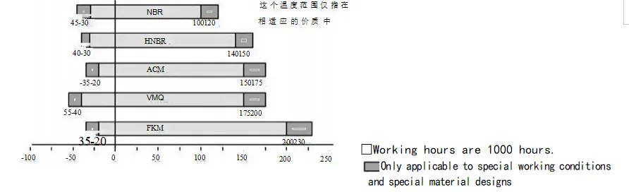 На эффект герметизации влияют десятки факторов. Помимо самого сальника, такого как его материал и структура, на эффект уплотнения напрямую влияют и другие факторы, такие как среда, температура, давление, смазка, скорость и шероховатость поверхности, и эти факторы часто взаимодействуют друг с другом. Следующие диаграммы предназначены только для справки для пользователей.