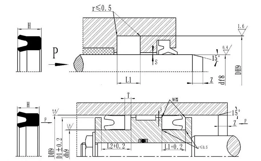 UHS U-Seal — это симметричное уплотнение для отверстий и валов. Он имеет меньшее сечение и может быть установлен в цельные пазы. При использовании под давлением 16–32 МПа в основании требуется стопорное кольцо.
